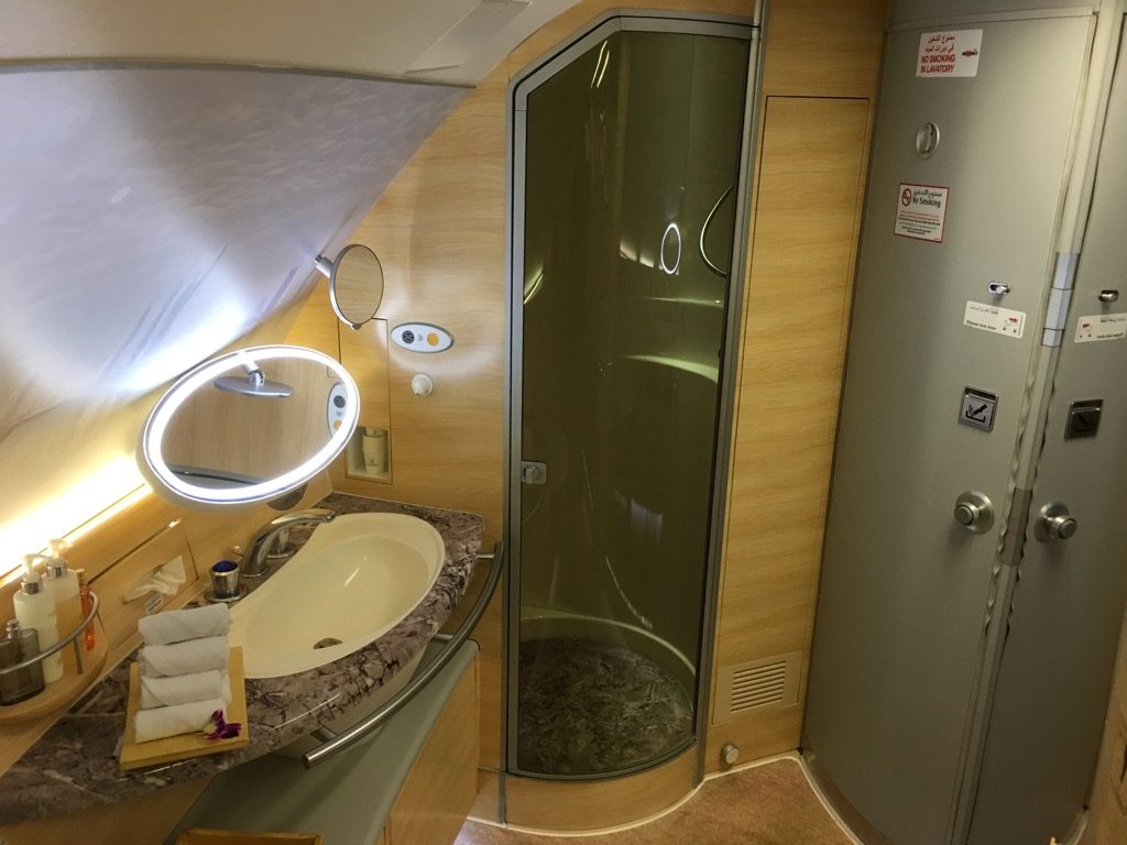 Entry is complimentary for first class, business class and eligible emirates skywards customers, and you can also pay to enjoy our lounge in dubai. I had selected suite 1k, which is the window seat on the right side in the first row. However, with the suite doors closed you cannot see them during sleep, like in the old first class suite. Yup, emirates first class gives you the option to shower on the plane. It definitely enhanced my mood when i walked around the cabin.